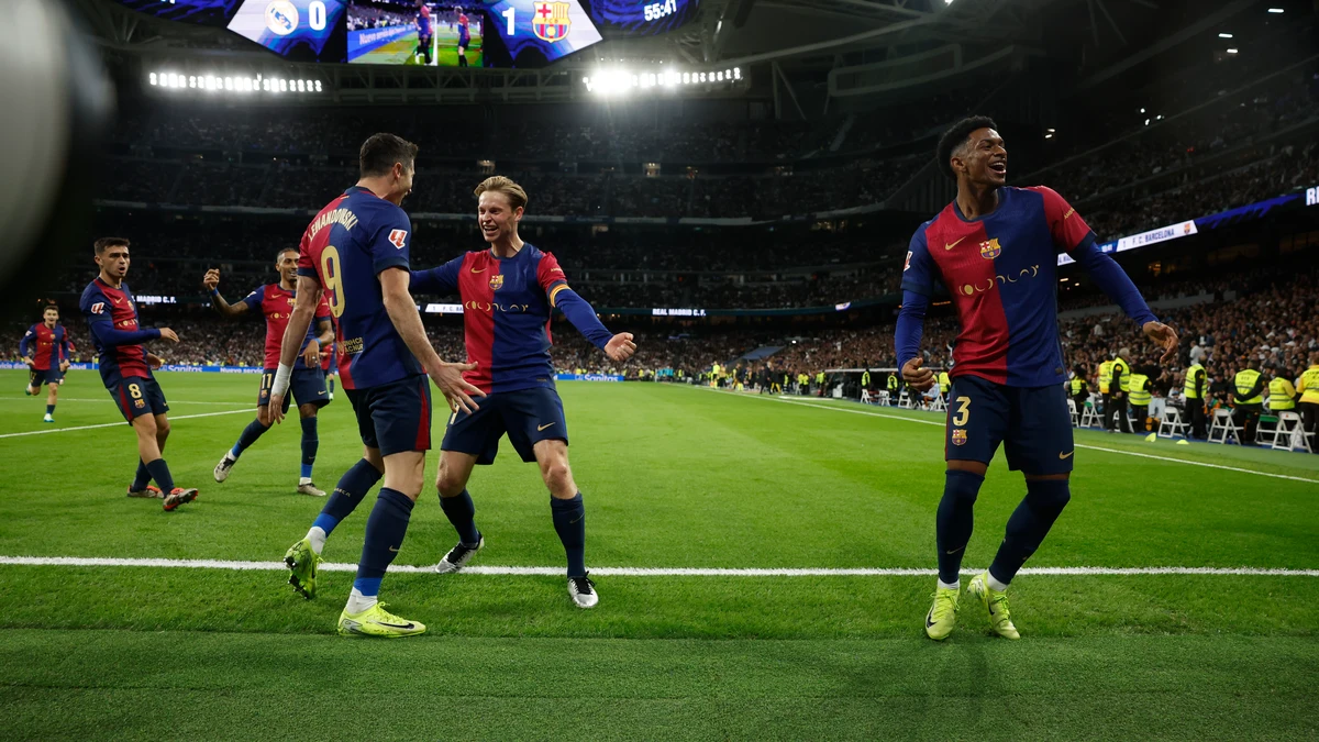 El Barcelona salía a la contra con una facilidad que asustaba. Hasta el delantero polaco se debió asustar porque pudo marcar dos goles más fáciles y los falló. El Madrid estaba ya fuera del partido, con alguna ocasión, pero con el miedo en el cuerpo al giro de Dani Olmo, que ya estaba en el campo. Lamine Yamal enseñó su camiseta para celebrar el tercer gol tras un partido sin mucho peso y Raphinha celebró su gran temporada con el cuarto en la fiesta azulgrana en el Bernabéu.