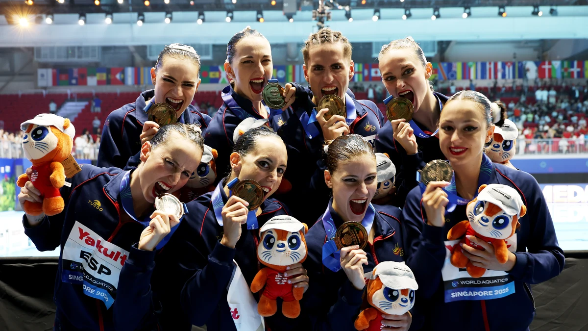 La natación artística española cerró su actuación en los Mundiales de Singapur con un total de nueve medallas, tras colgarse este viernes el bronce en la final de la rutina acrobática por equipos con una nota de 221,0962 puntos. El conjunto español, integrado por Cristina Arámbula, Txell Ferré, Marina García, Dennis González, Lilou Lluis, Txell Mas, Paula Ramírez y Sara Saldaña, se quedó a 7,9224 unidades de China, que encadenó su tercer título universal consecutivo con una puntuación de 229,0186. Completo el podio el equipo ruso, que compite en estos campeonatos bajo bandera neutral y que logró la medalla de plata con un total de 224,721 puntos, tres más que España.